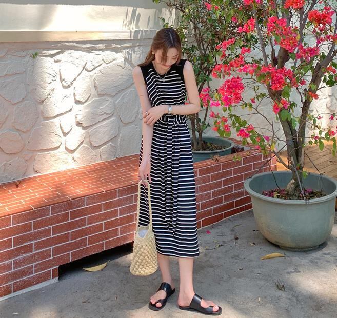 【送料無料】ボーダー ロングワンピース カジュアルコーデ◎韓国ファッション♩ノースリーブ 涼しげ◎(DM0113)