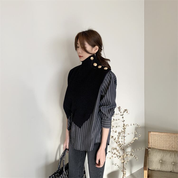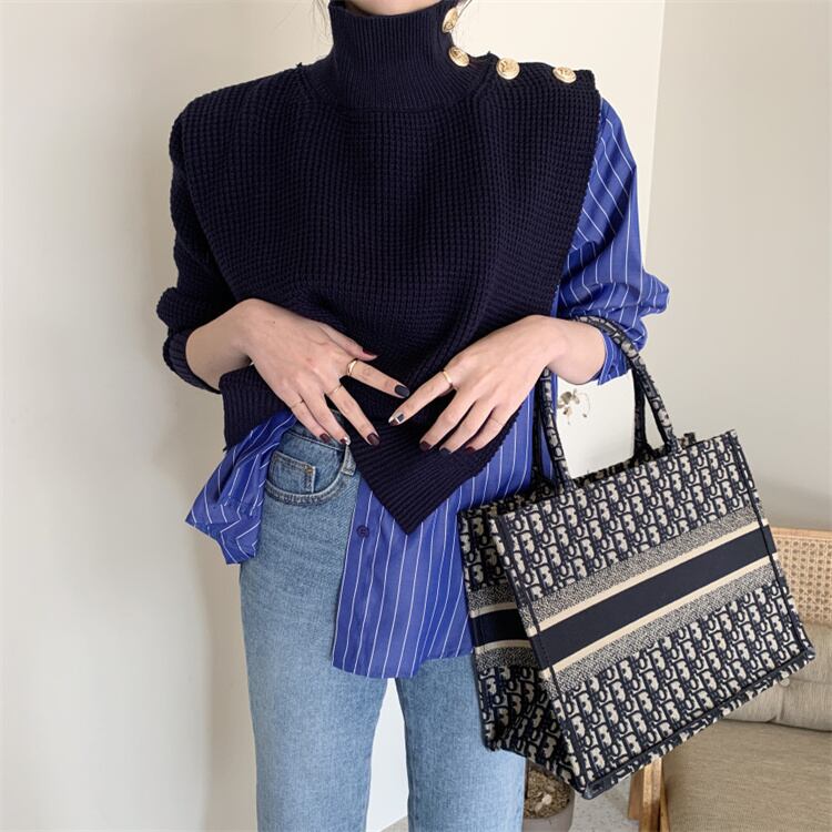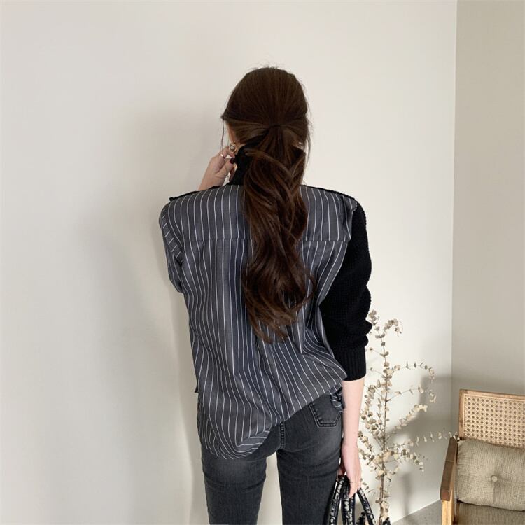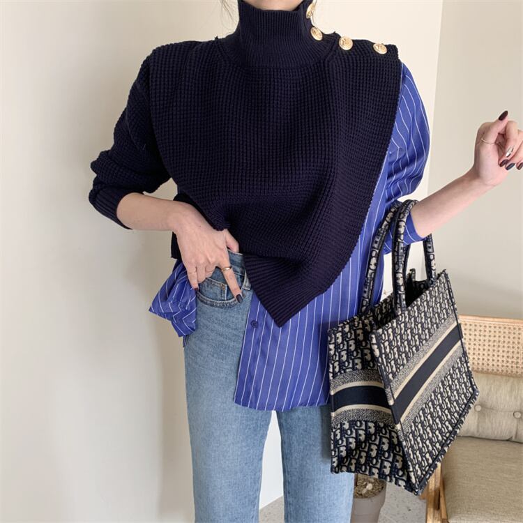 送料無料♡秋トレンド 韓国ファッション 縫付 シャツ フェイク2ピース ニットトップス セーター タートルネック(DM0169)