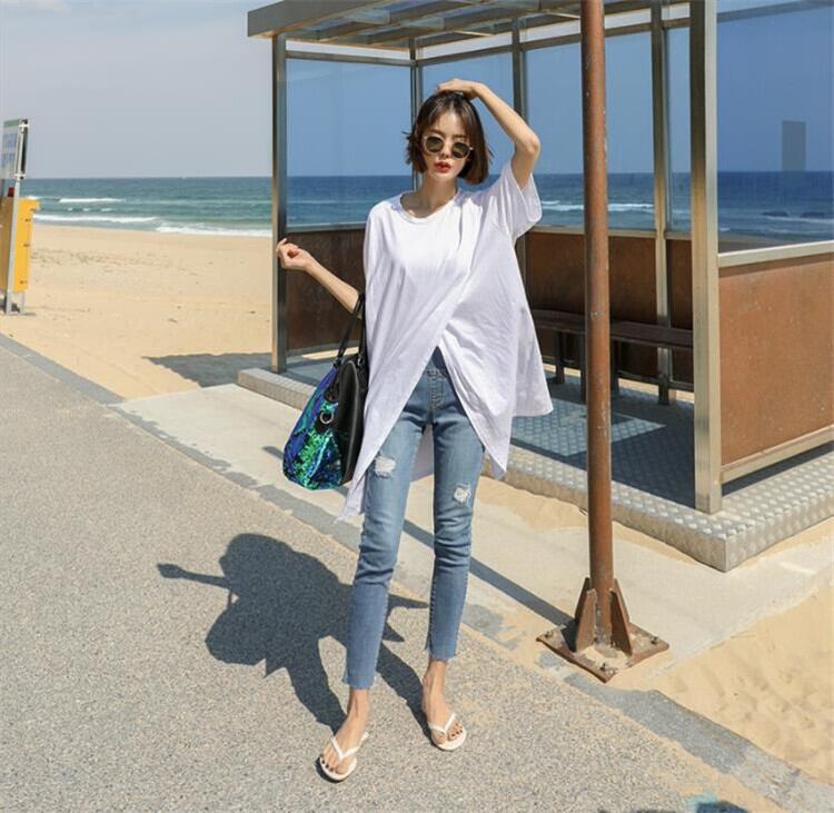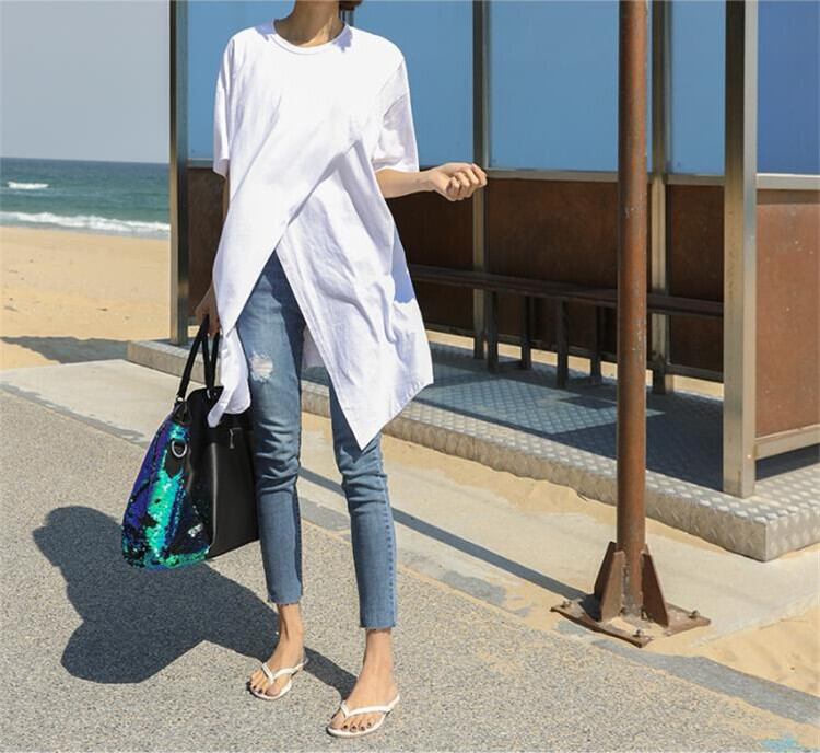ロングTシャツ レディース トップス 半袖 ホワイト ブラック 個性的 韓国ファッション INSスタイル(DM0271)